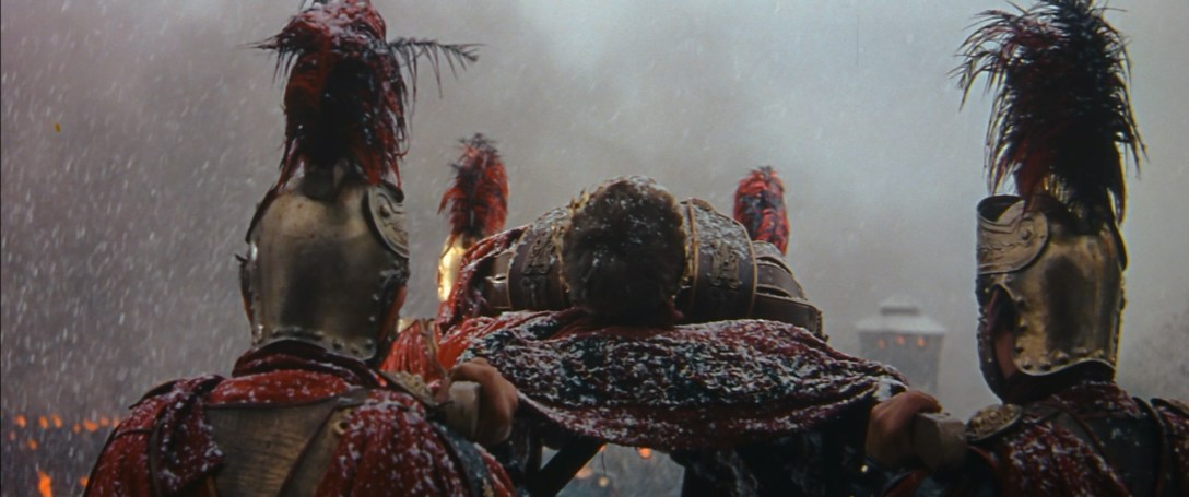 Fall is not always so artful. Mann’s careful direction cannot entirely overcome an undernourished, albeit well-structured, melodrama with a wooden heroic lead. Stephen Boyd, as the blonde Livius, fails to elevate the stock material, and as such the film tends to stall in its second half, when he becomes a major driving force for the narrative (otherwise, the film feels more like an ensemble piece, with James Mason and Christopher Plummer delivering particularly fine performances). Some flourishes, such as two separate attempts to give characters internal monologues via voiceover, feel strained and silly. Other sequences feel like gratuitous plays to audience expectation, such as a gratuitous chariot race lifted from Ben Hur (admittedly, it boasts some great stuntwork). Still, the film’s thematic trajectory and and its consistently vibrant images make it altogether much more compelling than its more simple-minded remake, Ridley Scott’s Gladiator, which borrows many of Fall‘s narrative beats but none of its conviction.